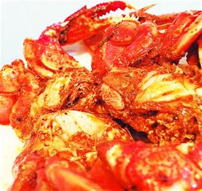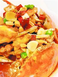 麻辣蟹:川菜風(fēng)味 中航酒店廚師長(zhǎng)張磊在成都進(jìn)修交流,用川菜的辦法做海捕蟹,很受當(dāng)?shù)厝讼矚g。他介紹,螃蟹用刷子刷干凈,揭開(kāi)蟹殼,大斬八塊。蔥姜拍散。用淀粉把蟹肉處封住。