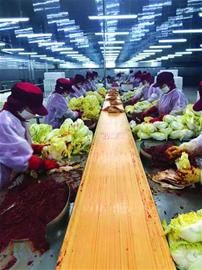 在生產(chǎn)車間,記者了解到,工人清洗白菜后,要將白菜放到鹽水中腌制10小時(shí)左右,使白菜變軟容易入味。 10個(gè)小時(shí)后。工人將腌制好的白菜控干水,再將紅色醬料均勻地涂抹在每層白菜葉中,再將這些白菜裝袋放到冷庫低溫發(fā)酵。 4條生產(chǎn)線,每天消化白菜1.5萬公斤。