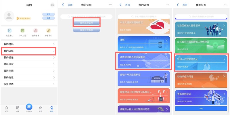 城鄉(xiāng)居民最低生活保障證、特困人員救助證等困難群體需要的電子證照只需要操作三步,即可申領。首先,打開“愛山東·青e辦”APP,登錄后,點開右下角“我的”,進入詳情頁后點擊“我的證照”。第二步,刷臉認證后,進入證照添加頁面,點擊“查詢添加證照”,搜索要申領的證照關鍵詞,點擊該證照。第三步,進入證照領取頁面后,點擊下方的添加到我的證照按鈕即為領取成功。