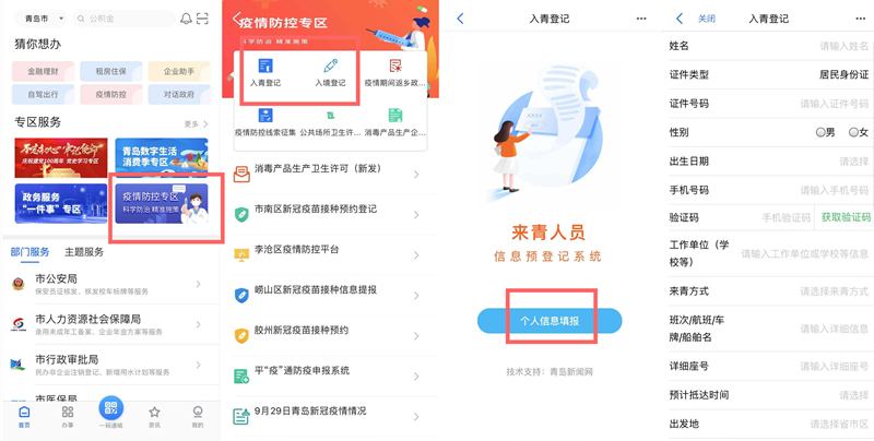 青島新聞網(wǎng)9月20日訊 當(dāng)前,國內(nèi)外新冠肺炎疫情防控形勢依然嚴(yán)峻復(fù)雜。國慶假期出行返青在即,為筑牢疫情外防輸入防線,根據(jù)省疫情防控指揮部要求,國內(nèi)中高風(fēng)險(xiǎn)地區(qū)以及境外入青返青人員,須提前報(bào)備及網(wǎng)上登記填報(bào)有關(guān)信息。為方便入青返青人員便捷登記,“愛山東·青e辦”接入了“來青人員預(yù)登記系統(tǒng)”及“青島市入境人員信息系統(tǒng)”,實(shí)現(xiàn)個(gè)人信息掌上申報(bào)。