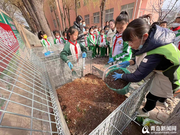 春季開學(xué)伊始,學(xué)校邀請青島你我創(chuàng)益社工的堆肥指導(dǎo)專家封雙老師入校,向孩子們講解堆肥知識(shí)、操作步驟、注意事項(xiàng)等。一層廚余垃圾加上一層干料落葉、菌粉,經(jīng)過科學(xué)配比發(fā)酵45—60天,就會(huì)變成“黑金土”,用它種植植物,就會(huì)成為植物寶貴的自然養(yǎng)料……孩子們了解到這些知識(shí),摩拳擦掌躍躍欲試,從學(xué)校食堂收集了大量廚余垃圾,變理論為實(shí)踐,開始“三明治”堆肥,待廚余垃圾發(fā)酵后和沙土融合在一起,變成營養(yǎng)土“黑金土”,為學(xué)?!吧鷳B(tài)幸福農(nóng)場”的瓜果蔬菜茁壯成長提供源源不斷的有機(jī)動(dòng)力。