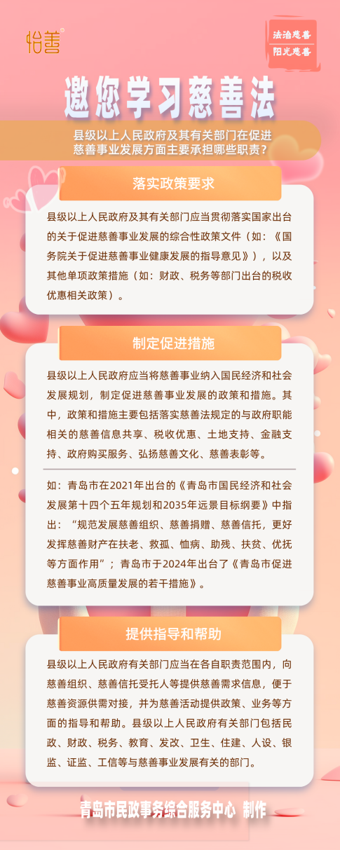 怡善·慈善法規(guī)|邀您學(xué)習(xí)慈善法-縣級(jí)以上人民政府及其有關(guān)部門在促進(jìn)慈善事業(yè)發(fā)展方面主要承擔(dān)哪些職責(zé)?